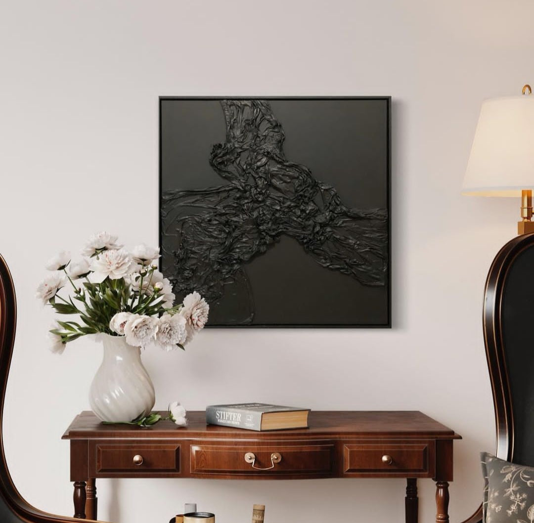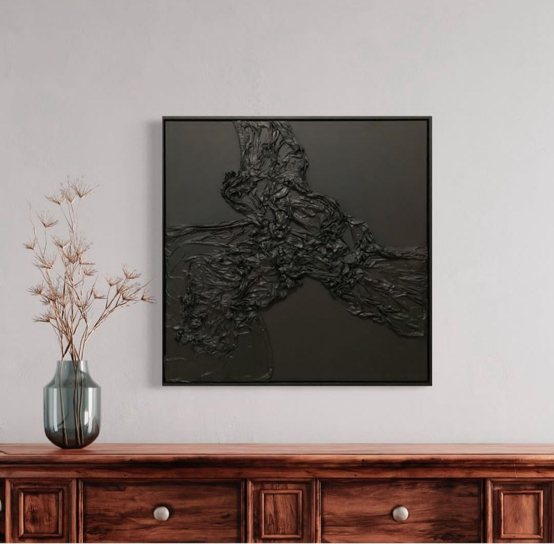 This piece measures 76x76cm and comes in a black floating frame and hanging wire in the back.